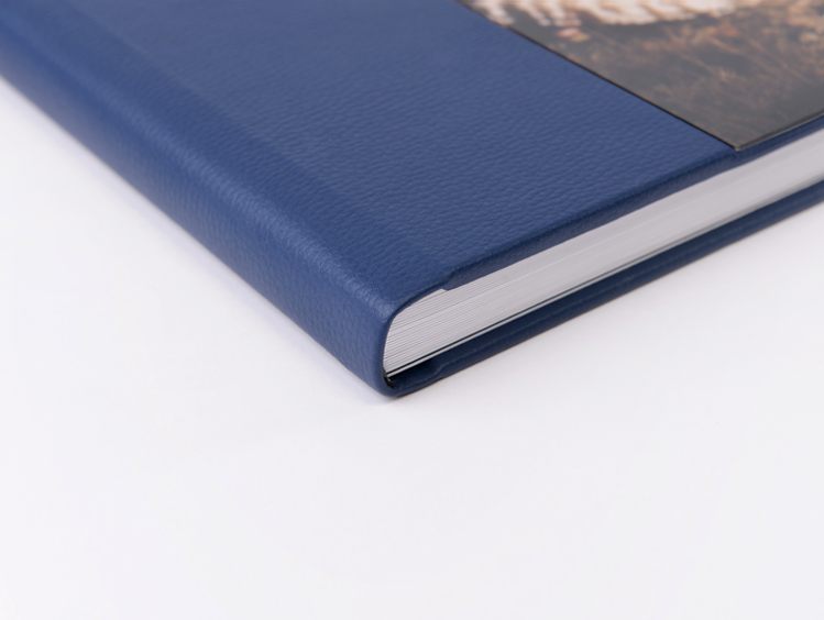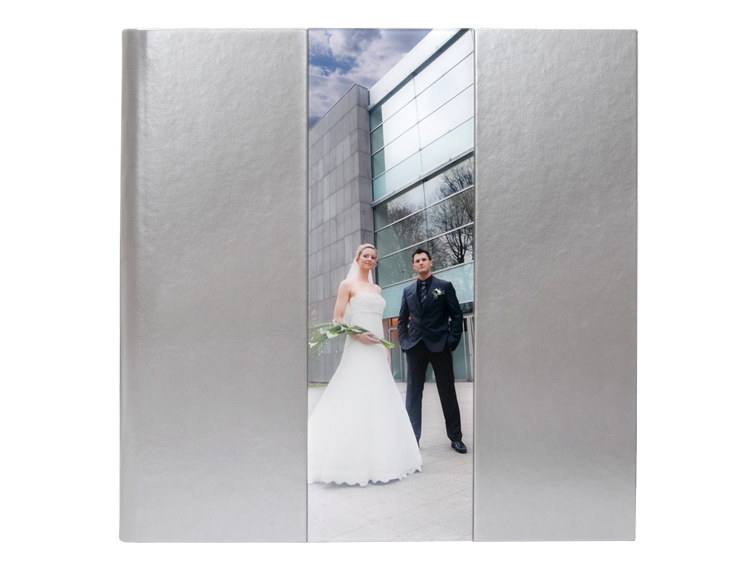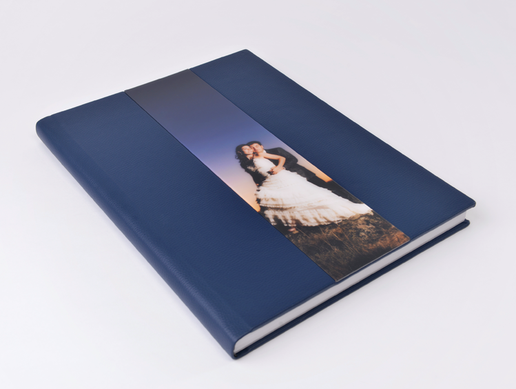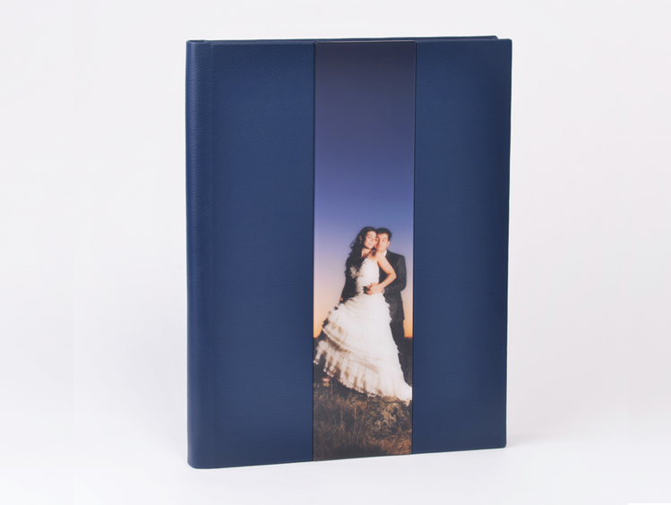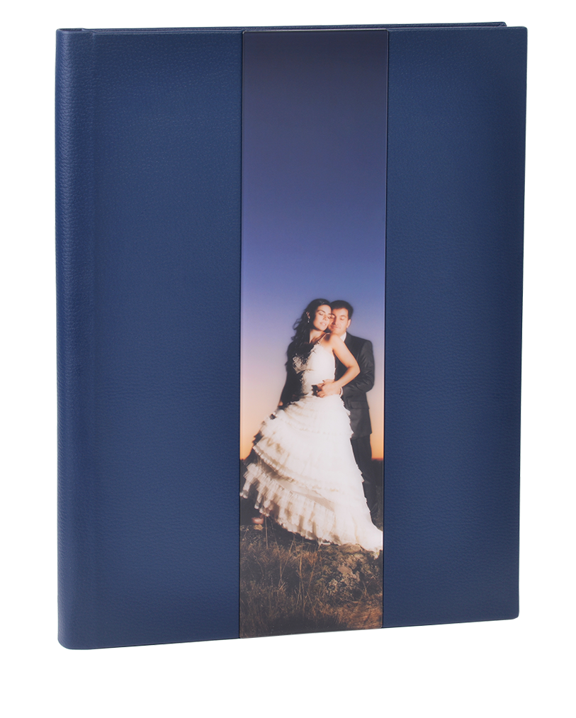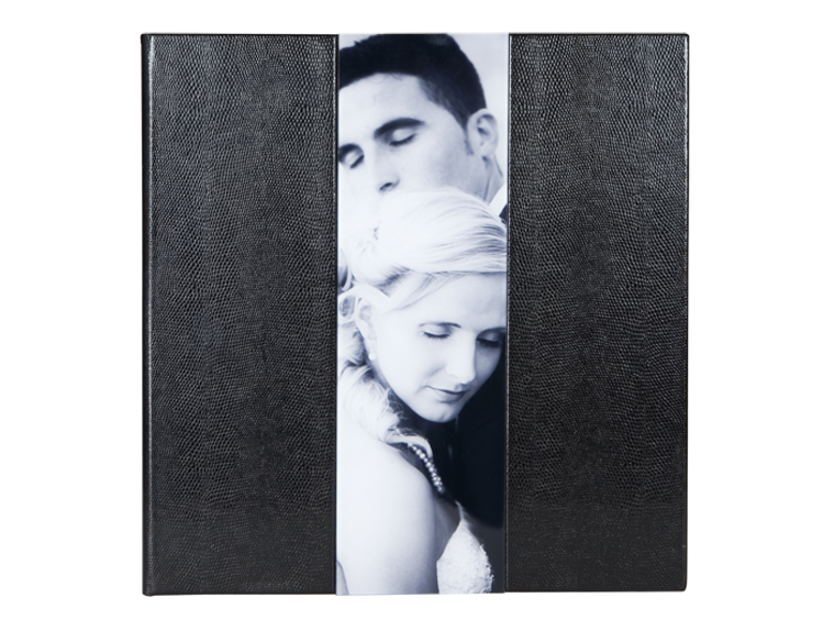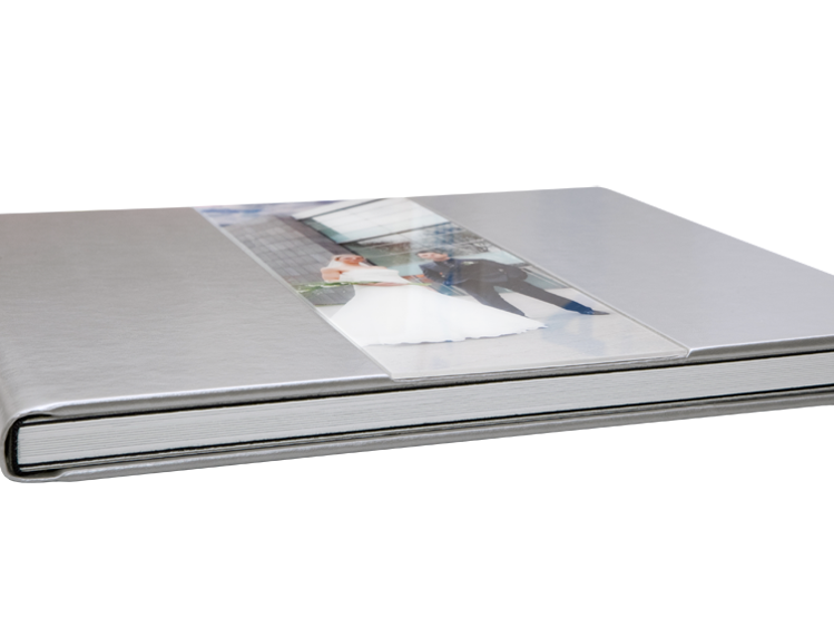 Transparente Leiste in Acryl/glänzend mit Wunschmotiv, Albendeckel, Rückdeckel und Albenrücken aus Kunstleder. Auch in Echtleder lieferbar.